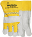 Premium heavyweight split cowhide leather. Cotton drill back. Inside double leather palm. Outside elastic wrist with slip-on style safety cuff.