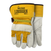 Economy-grade full-grain cowhide leather, cotton drill back, outside elastic wrist, slip-on style safety cuff