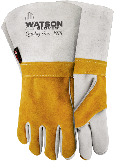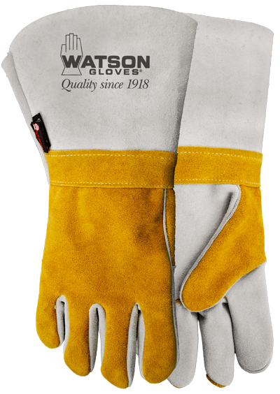 A Watson Classic, split cowhide leather, cotton drill back, shirred elastic wrist, slip-on style safety cuff